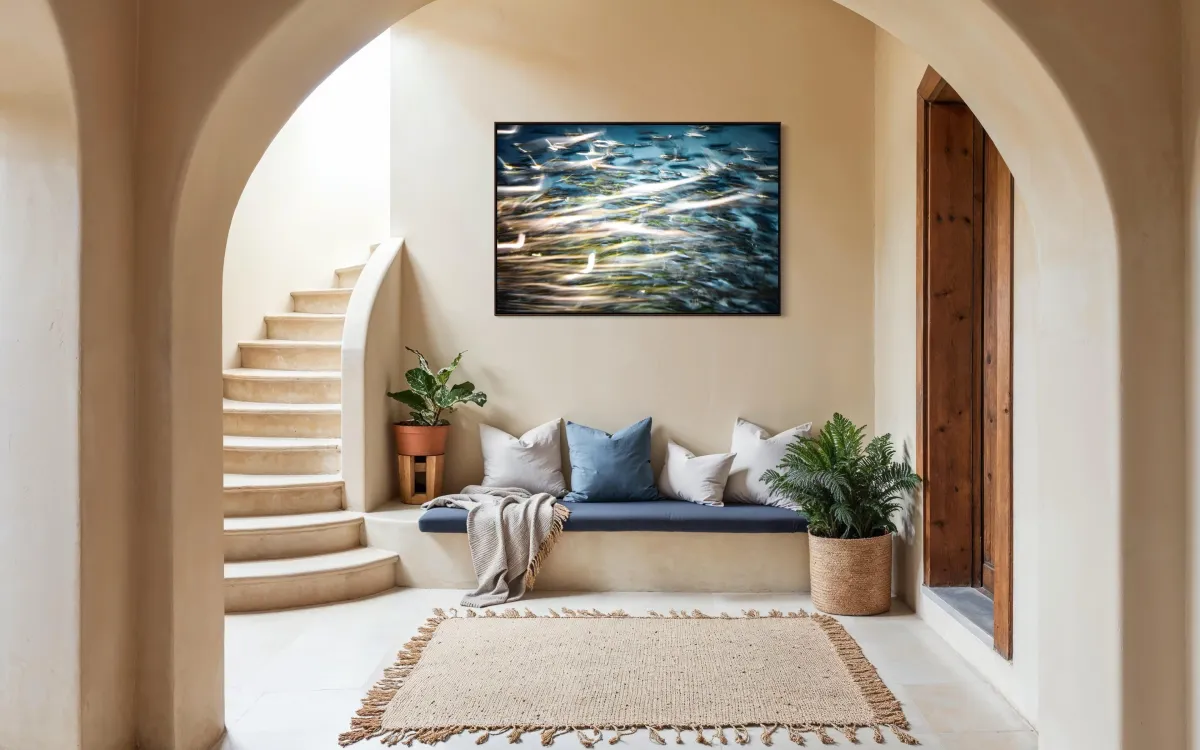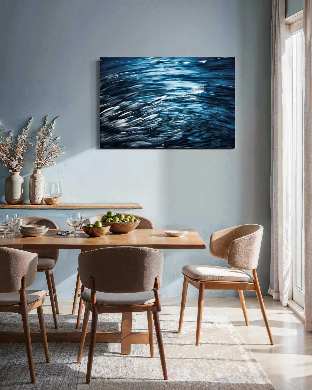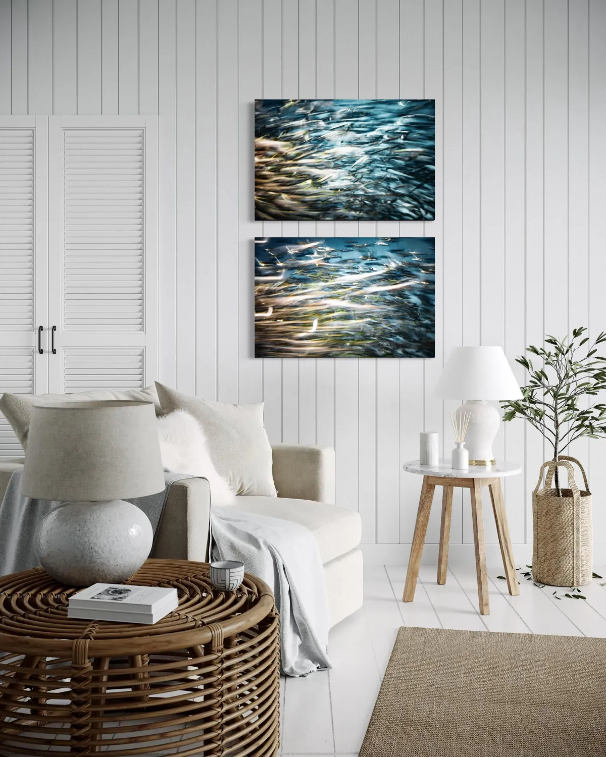 These works follow that collective rhythm: bodies turning together, one fish drifting slightly out of sync, then the formation gathering itself again. Structure and freedom coexist here. So do repetition and surprise.