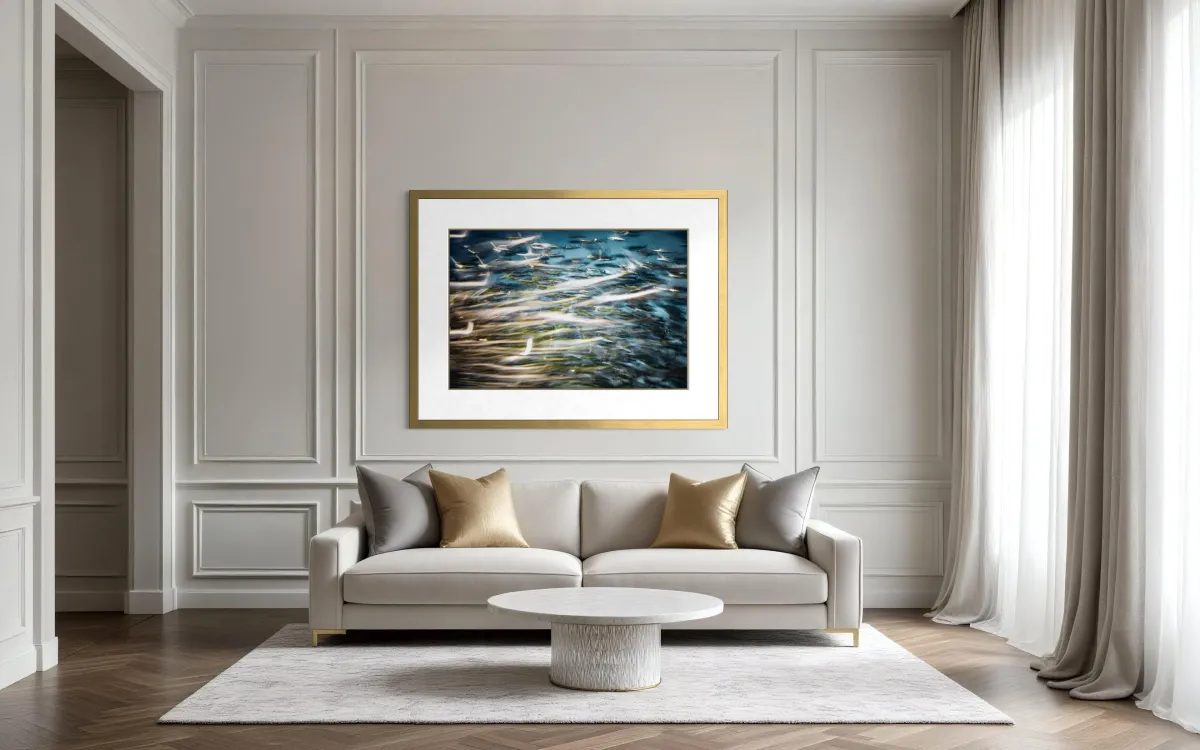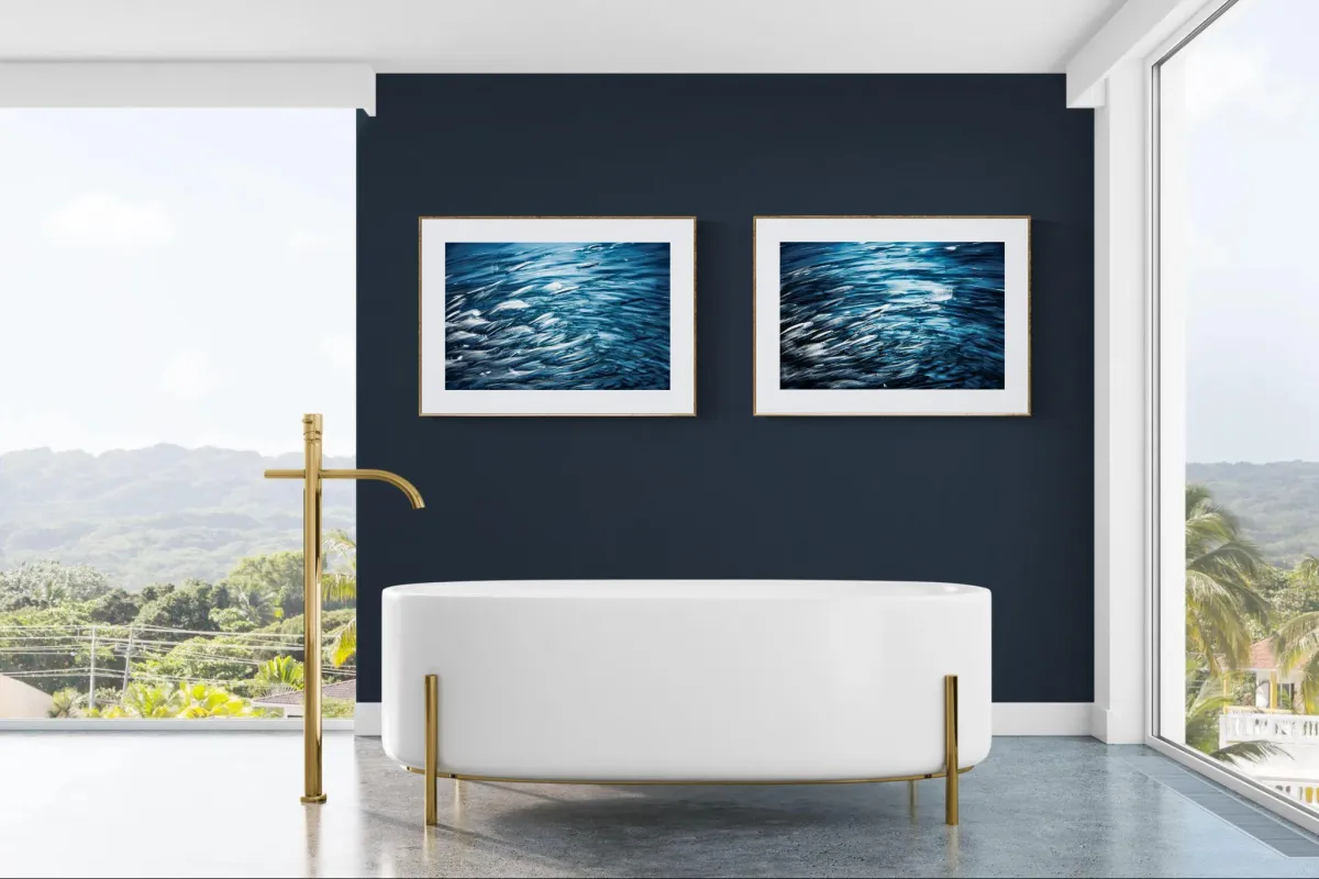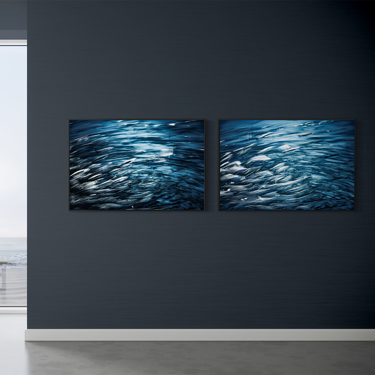 These works follow that collective rhythm: bodies turning together, one fish drifting slightly out of sync, then the formation gathering itself again. Structure and freedom coexist here. So do repetition and surprise.